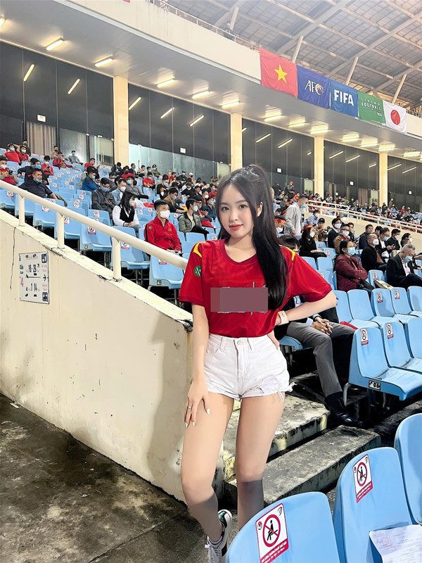 Hot girl Phương Anh diện áo thể thao kết hợp quần jeans siêu ngắn dù sân Mỹ Đình ai cũng mặc kín mít. Ngoài ra, chi tiết trên áo còn bị người hâm mộ lên án kịch liệt.