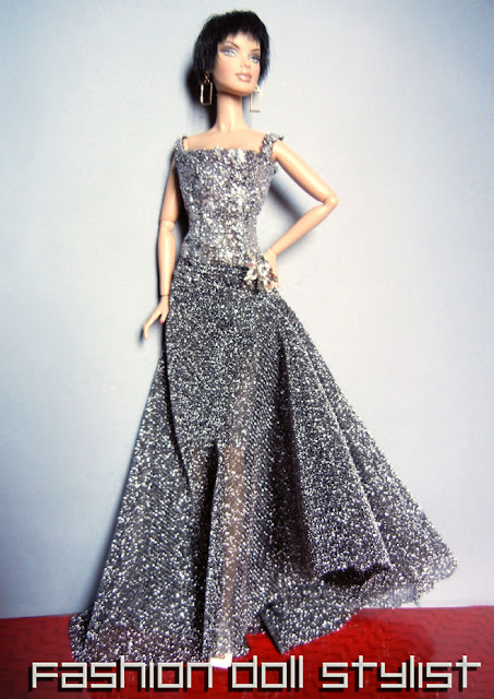1. It begins with a strapless sheath. I have added glitter to the dress down to the top of the hips. And I have added small straps made from glittered lurex strips.
